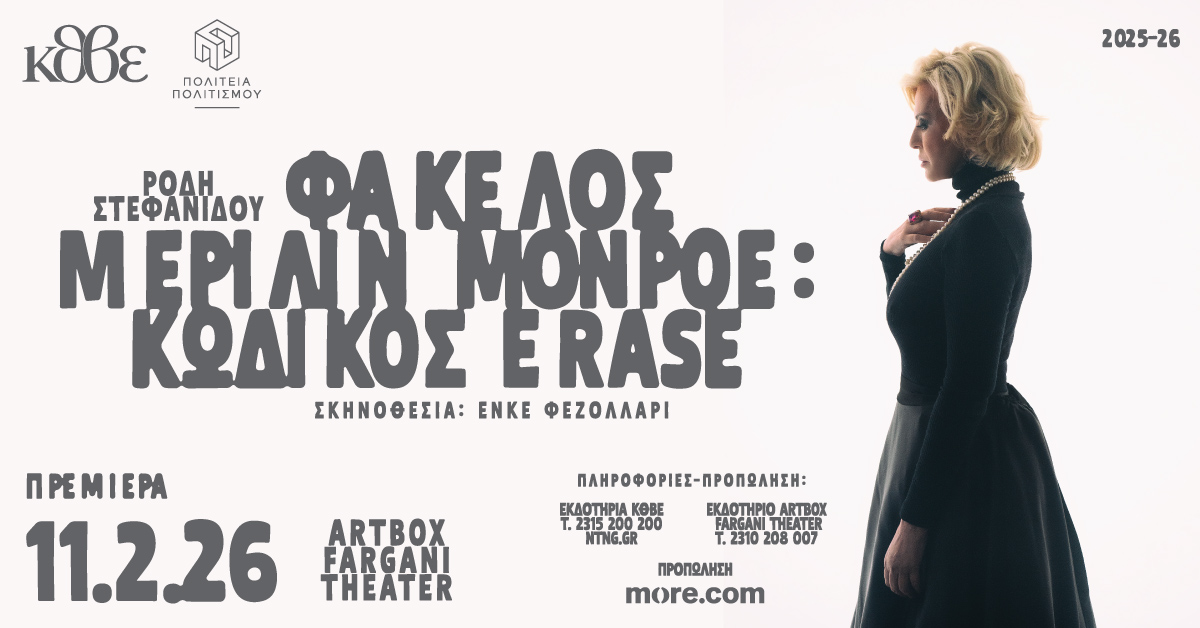 Με αφορμή τη συμπλήρωση 100 χρόνων από τη γέννηση του εμβληματικού μύθου του Χόλυγουντ, το Κρατικό Θέατρο Βορείου Ελλάδος, σε συνεργασία με την Πολιτεία Πολιτισμού, παρουσιάζουν την παράσταση «Φάκελος Μέριλιν Μονρόε: Κωδικός Erase».