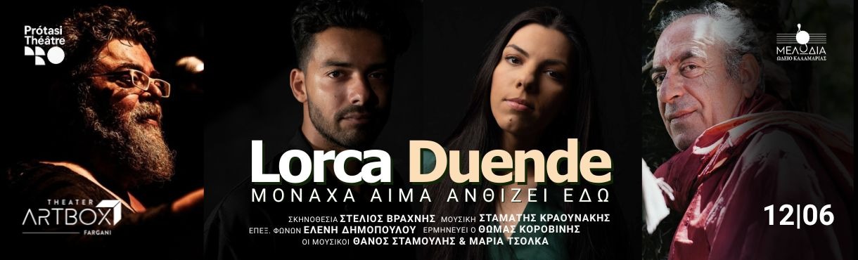 Η Εταιρεία Θεάτρου Πρόταση και το Ωδείο Καλαμαριάς «Μελωδία» συμπράττουν και παρουσιάζουν το «Duende / Μονάχα αίμα ανθίζει εδώ» σε σκηνοθεσία Στέλιου Βραχνή, στις 12 Ιουνίου, στο ArtBox Fargani. Μια πρωτότυπη σκηνική και ηχητική σύνθεση βασισμένη στα ποιητικά και θεατρικά γραπτά του Federico García Lorca και στις μελοποιήσεις του μεγάλου Έλληνα συνθέτη Σταμάτη Κραουνάκη.