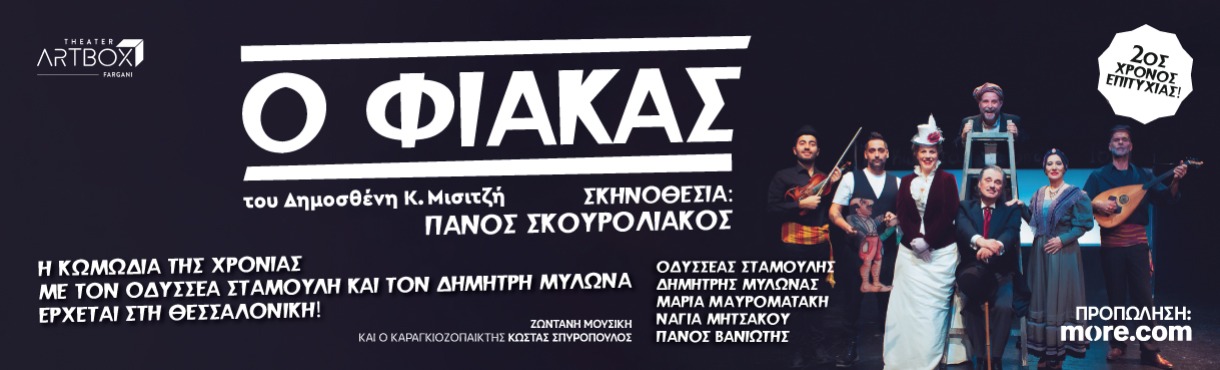 Μετά τη μεγάλη επιτυχία στην Αθήνα και τα συνεχόμενα sold out, η κωμωδία της χρονιάς «Ο Φιάκας» του Δημοσθένη Κ. Μισιτζή που μέχρι στιγμής την έχουν παρακολουθήσει πάνω από 10.000 θεατές, σε σκηνοθεσία Πάνου Σκουρολιάκου και με τους  Οδυσσέα Σταμούλη στο ρόλο του αξιαγάπητου απατεώνα Φιάκα και Δημήτρη Μυλωνά στο ρόλο του παμπόνηρου υπηρέτη του, Γιάννη, έρχεται από τις 23 Μαρτίου στη Θεσσαλονίκη, στο Θέατρο Artbox Fargani.